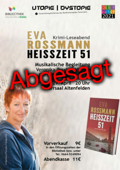 ABGESAGT: Der mehrmals verschobene Krimi-Leseabend der Bibliothek Altenfelden mit Eva Rossmann („(HEISSZEIT 51“) muss auf Grund der Corona-Lage am 29. April 2021 endgültig abgesagt werden.