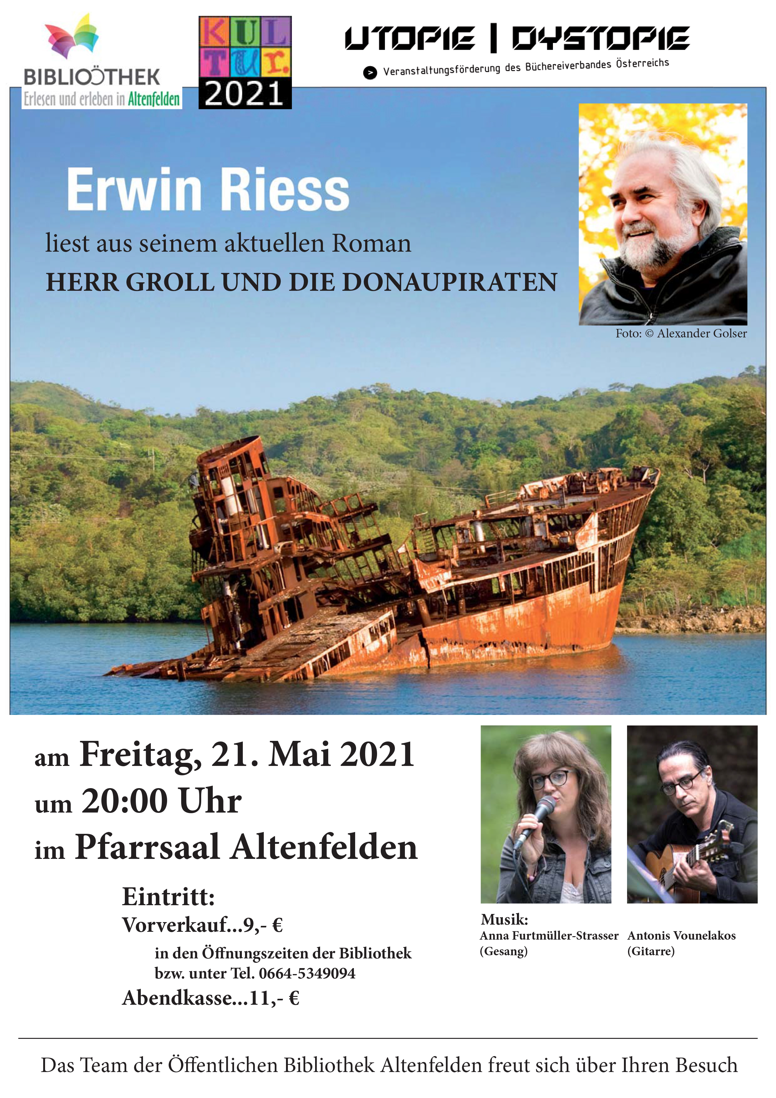Erwin Riess liest aus seinem aktuellen Roman Herr Groll und die Donaupiraten. am Freitag, 21. Mai 2021 um 20:00 Uhr im Pfarrsaal Altenfelden Musik Anna…